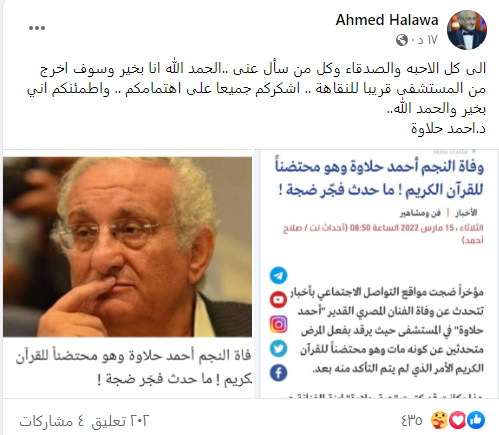 وكتب أحمد حلاوة في منشوره: إلى كل الأحبة والأصدقاء وكل من سأل عنى..الحمد الله أنا بخير وسوف أخرج من المستشفى قريبا للنقاهة.. أشكركم جميعا على اهتمامكم.. واطمئنكم أني بخير والحمد لله.