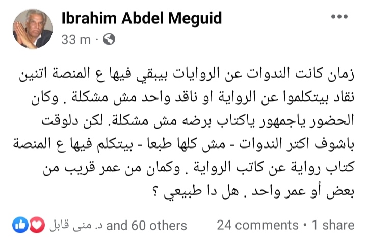 وقال إبراهيم عبد المجيد في منشور على صفحته الشخصية بموقع التواصل الاجتماعي فيسبوك، إن الندوات عن الروايات قديمًا كان يتواجد بها اثنين من النُقَّاد على الأقل فوق المنصة، يتجاذبون أطراف العمل ويناقشوه، أو حتى ناقدًا واحدًا، مضيفًا أن الجمهور الحاضر كان أكثره من الكُتَّاب أو النقاد.
