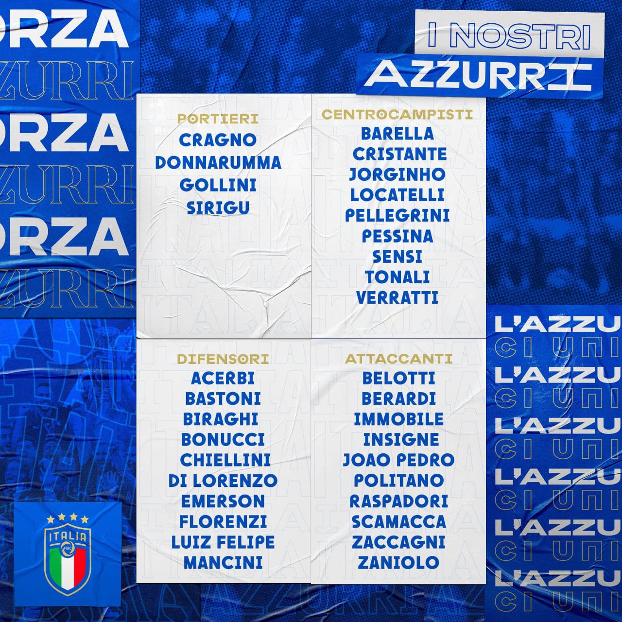 خط الهجوم: دومينيكو بيراردي (ساسولو)، جيانلوكا سكاماكا (ساسولو)، جواو بيدرو (كالياري)، ماتيو بوليتانو (نابولي)، جياكومو راسبادوري (ساسولو)، ماتيا زاكاني (لاتسيو)، لورينزو إنسيني (نابولي)، نيكولو زانيولو (روما)، أندريا بيلوتي (تورينو)، شيرو إيموبيلي (لاتسيو).