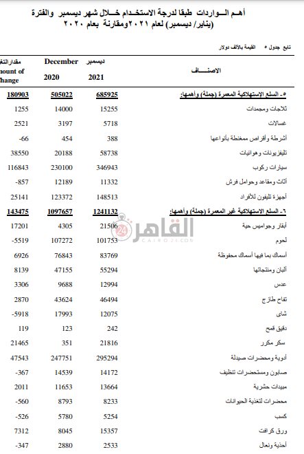 وانخفضت قيمة الواردات بعض السلع على رأسها القمح 258.5 مليون دولار ديسمبر 2021 مقابل 280.5 مليون دولار خلال ديسمبر 2020 بنسبة انخفاض قدرها 7.8%، وفقا لتقرير الجهاز المركزي للتعبئة العامة والإحصاء.