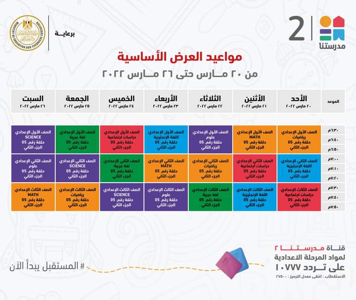 ونشرت القناة عبر صفحتها الرسمية على موقع التواصل الاجتماعي، فيسبوك، قائلة: إنه يمكنكم يا أعزاءنا متابعة مواعيد عرض البرامج التعليمية الخاصة بالصفوف الإعدادية للأسبوع الـ 5 للفصل الدراسي الثاني مع الإعادة على التردد 10777 أفقي.