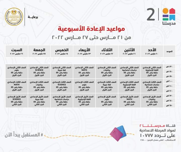 أعلنت وزارة التربية والتعليم والتعليم الفني، جداول مواعيد عرض البرامج التعليمية للمناهج الدراسية المقررة على جميع طلاب المرحلة الإعدادية، والتي من المقرر بثها على قناة مدرستنا 2.