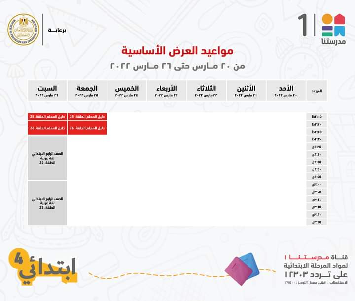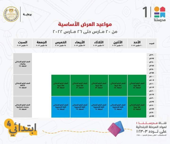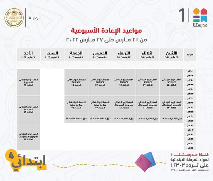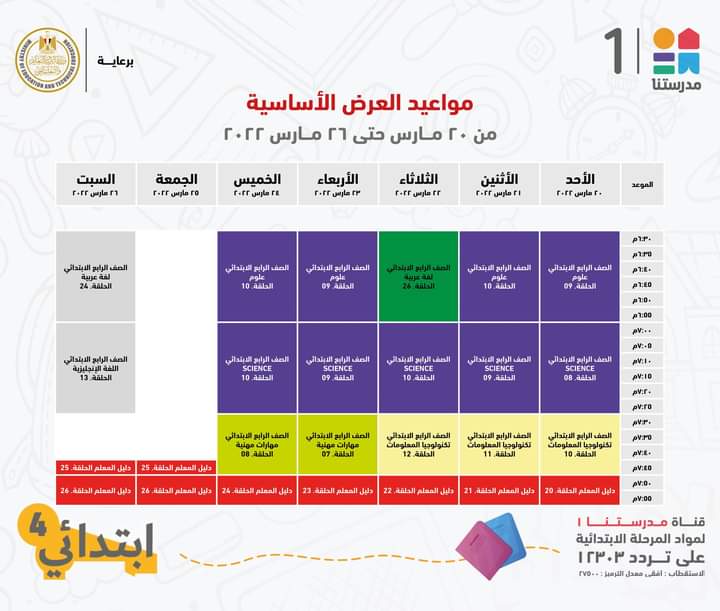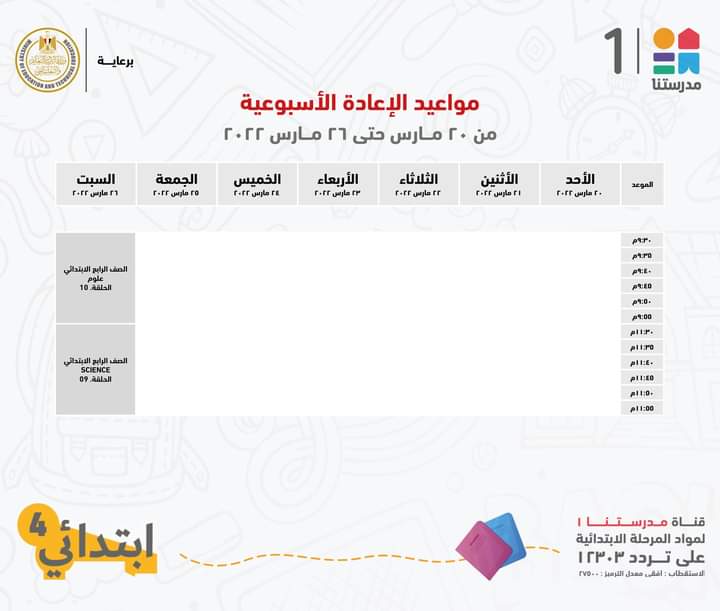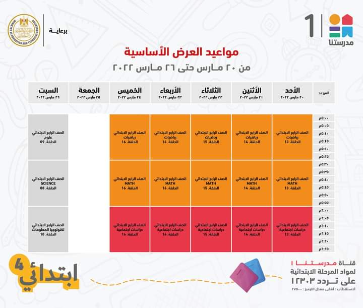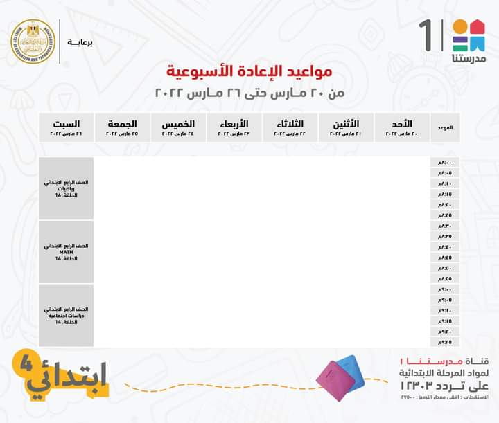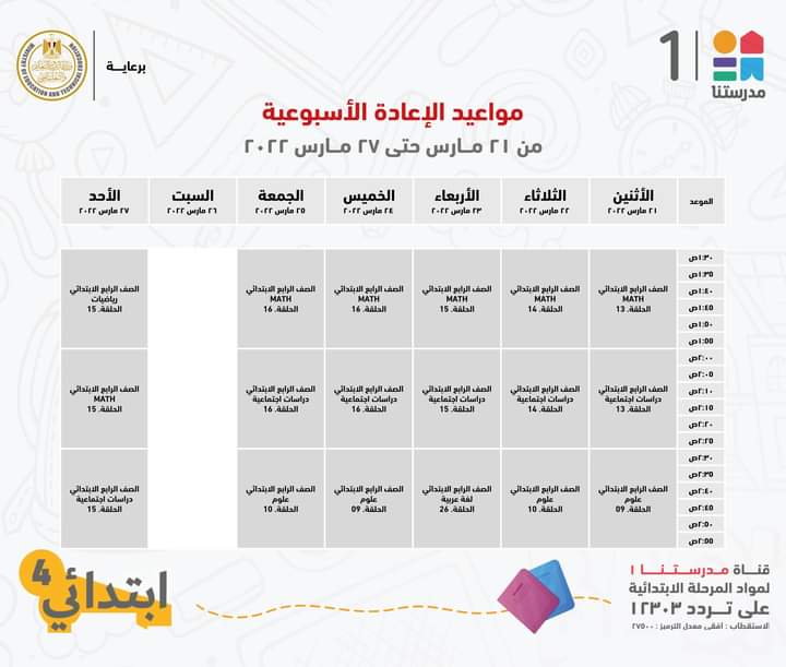 أعلنت قناة مدرستنا 1، التابعة لوزارة التربية والتعليم والتعليم الفني، الجدول الخاص بالصف الرابع الابتدائي مع الإعادة.