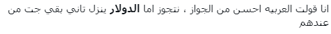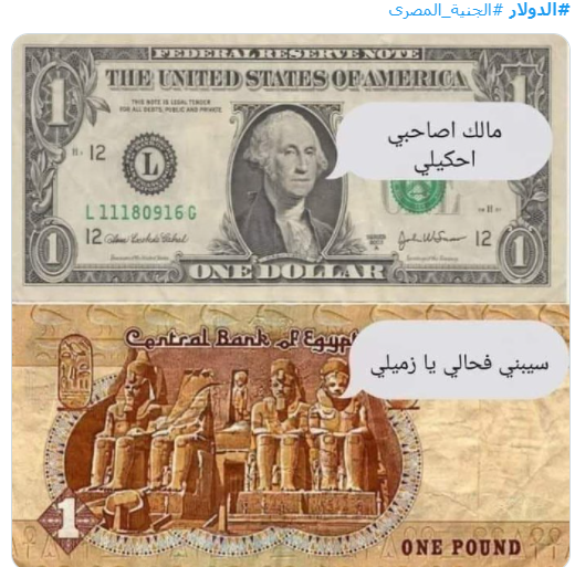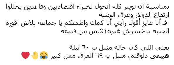 وغرد حساب آخر: بمناسبة أن تويتر كله اتحول لخبراء اقتصاديين وقاعدين يحللوا ارتفاع الدولار وغرق الجنيه، فـ أنا عايز أقول رآيي أنا كمان وأطمنكم يا جماعة بلاش أڤورة، الجنيه ماخسرش غير 15٪ بس من قيمته يعني اللي كان حاله منيل بـ 60 نيلة هيبقى دلوقتي منيل بـ 69 الفرق مش كبير.