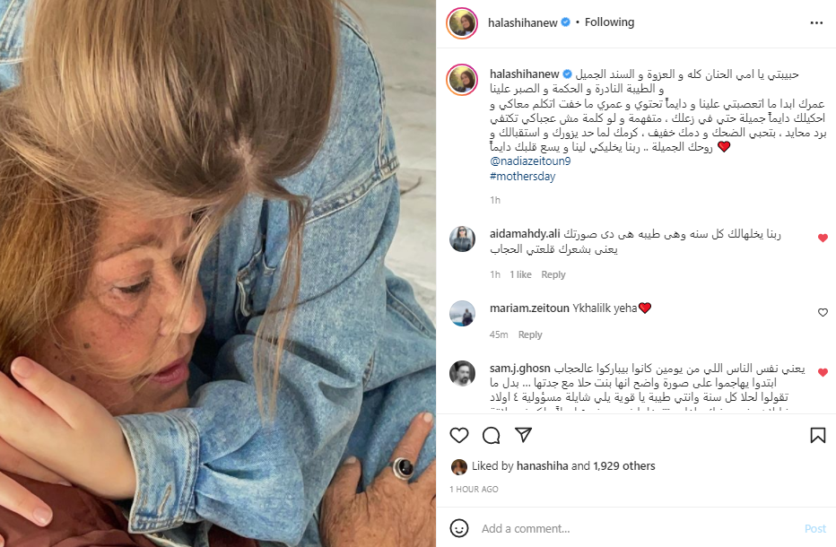وعلقت حلا شيحة على الصورة موجهة رسالة لوالدتها عبر حسابها بموقع انستجرام: حبيبتي يا أمي الحنان كله والعزوة والسند الجميل والطيبة النادرة والحكمة والصبر علينا.