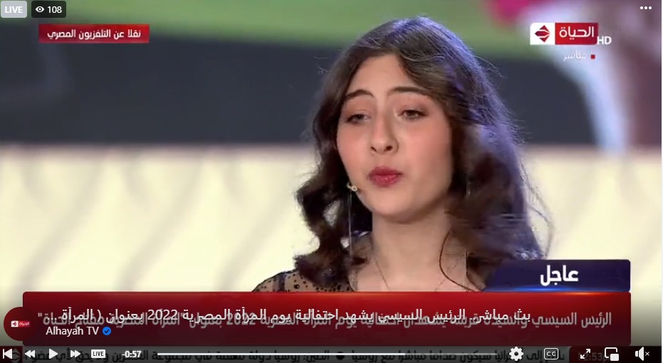 قدمت كلًا من المطربة ريهام عبد الحكيم، ومي فاروق، وحنان عصام، وإيمان عبدالغني، مجموعة من الأغاني ضمن فاعليات احتفالية المرأة المصرية والأم المثالية، المنعقدة الآن بمركز المنارة للمؤتمرات والمعارض الدولية، بحضور الرئيس عبد الفتاح السيسي، وقرينته السيدة انتصار السيسي.