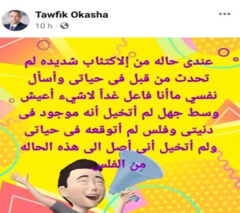 وكتب توفيق عكاشة، منشورًا عبر حسابه الشخصي بموقع التواصل الاجتماعي فيسبوك: عندي حالة من الاكتئاب شديدة لم تحدث من قبل في حياتي، وأسأل نفس ما أنا فاعل غدًا، لا شيء، أعيش وسط جهل لم أتخيل أنه موجود في دنيتي، وفلس لم أتوقعه في حياتي، ولم أتخيل أني أصل إلى هذه الحالة من الفلس.
