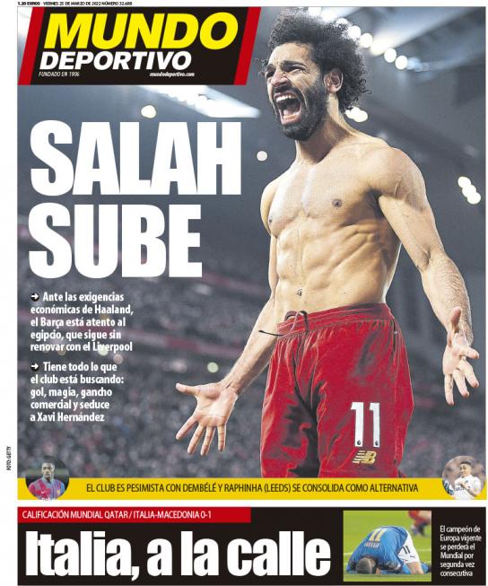 تصدر محمد صلاح غلاف صحيفة موندو ديبورتيفو الإسبانية لعدد اليوم، وذلك تحت عنوان: صلاح يصعد، وذلك في إشارة لاستخدام إدارة برشلونة لخيار ضم محمد صلاح المميز ماليًا في الفترة المقبلة.