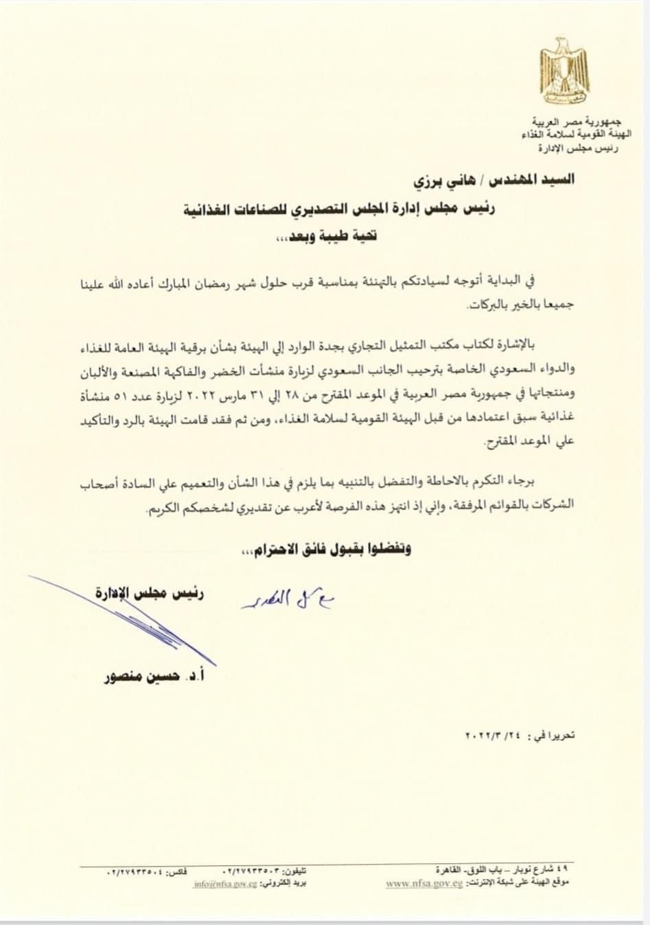 وأوضحت هيئة سلامة الغذاء، أنه بالإشارة إلى الكتاب الدوري الوارد من مكتب التمثيل التجاري المصري بجدة بشأن برقية الهيئة العامة لسلامة الغذاء والدواء السعودية الخاص بترحيب الجانب السعودي لزيارة منشآت الصناعات الغذائية المنتجة للخضار والفاكهة والألبان في موعد مقترح من 28 لـ31 مارس، حيث سيزور 51 منشأة معتمدة من هيئة سلامة الغذاء وأكدت السعودية على الموافقة على الزيارة.
