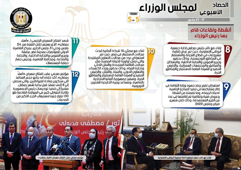 نشر المركز الإعلامي لمجلس الوزراء، تقريرا شمل إنفوجرافات سلط من خلالها الضوء على الحصاد الأسبوعي لمجلس الوزراء، وذلك خلال الفترة من 19 حتى 25 مارس 2022، والذي تضمن الموافقة على عدد من القرارات، فضلًا عن الاجتماعات واللقاءات التي عقدها الدكتور مصطفى مدبولي، رئيس مجلس الوزراء، بالإضافة إلى ما قام به من أنشطة.