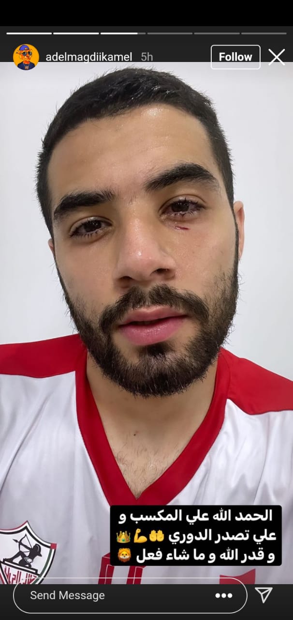 كما نشر عادل مجدي، صورة له وتظهر على وجهه الإصابات، عبر خاصية ستوري على موقع تبادل الصور والفيديوهات انستجرام، وكتب: الحمدلله على المكسب وتصدر الدوري.. وقدر الله وما شاء فعل.