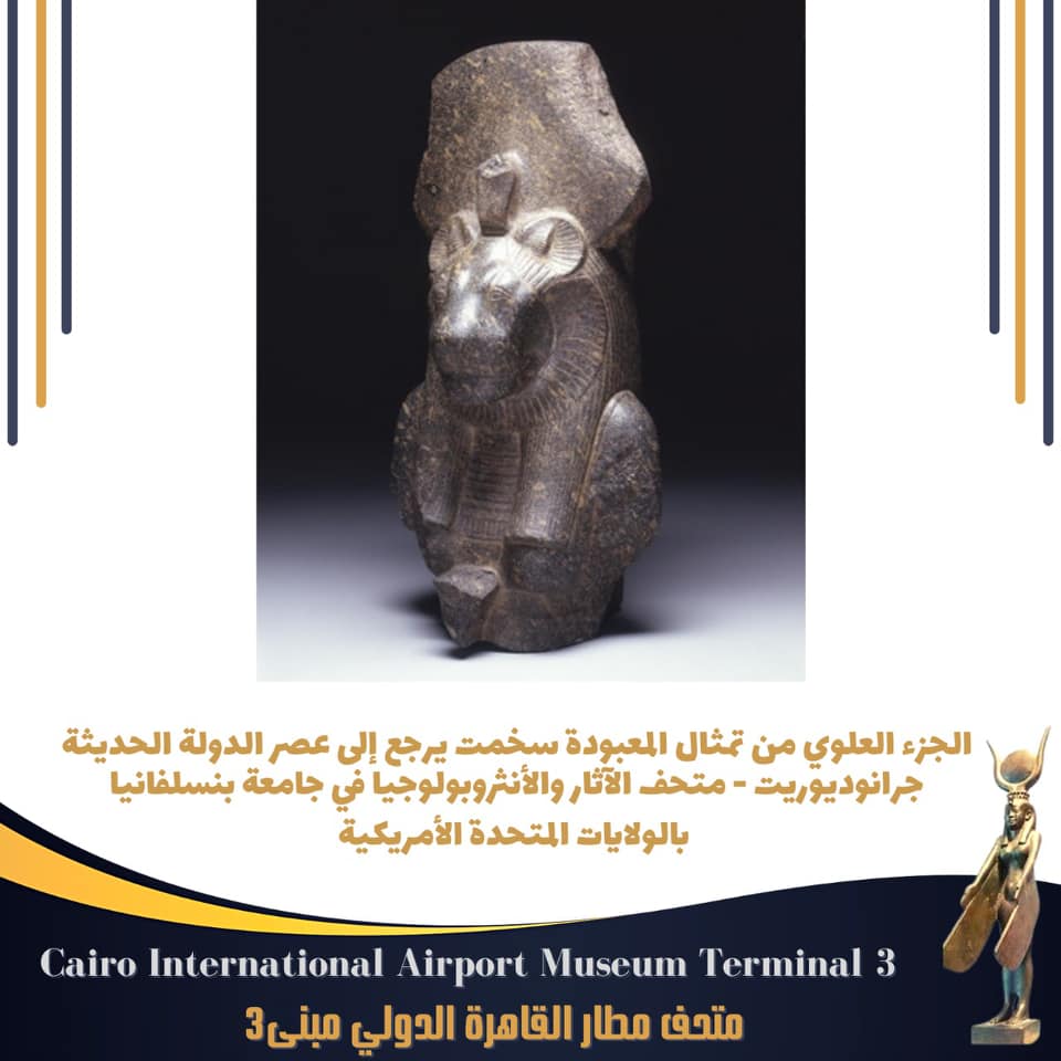 ونشرت إدارة متحف مطار القاهرة الدولي، عبر الصفحة الرسمية، صُورة للقطعة المعروضة معلقة: سخمت ابنة الإله رع إله الشمس، وتصور في هيئة أنثى برأس لبؤة، وتعتبر اللبؤة هي الحيوان المقدس لها، وتصور أما جالسة على العرش، وتمسك في يدها عنخ مفتاح الحياة أو واقفة، وممسكة في يدها صولجان على شكل زهرة اللوتس، ودائمًا يعلو رأسها قرص الشمس وثعبان الكوبرا، كما تعددت ألقابها مثل عين رع – سيدة الأرضين – سيدة الرداء الأحمر – سيدة الحياة.