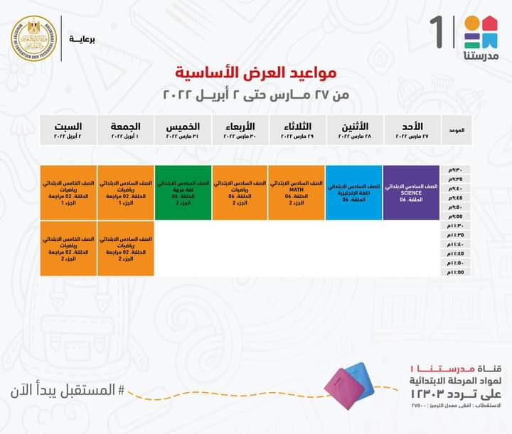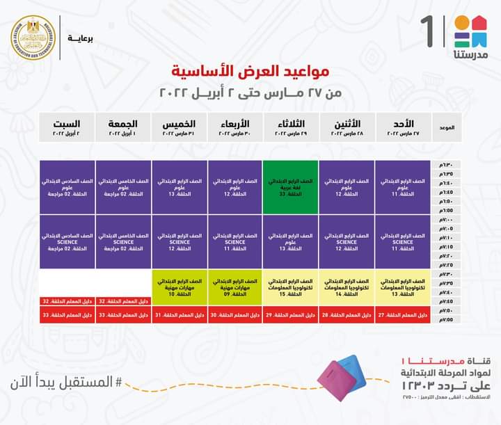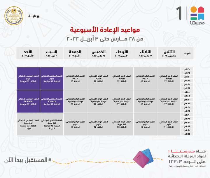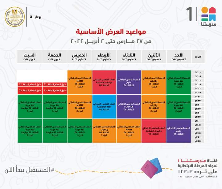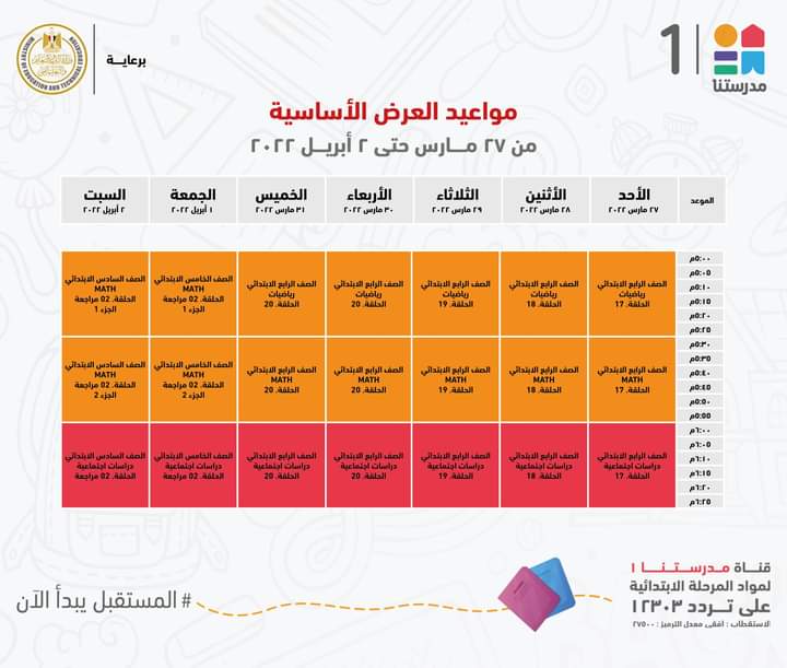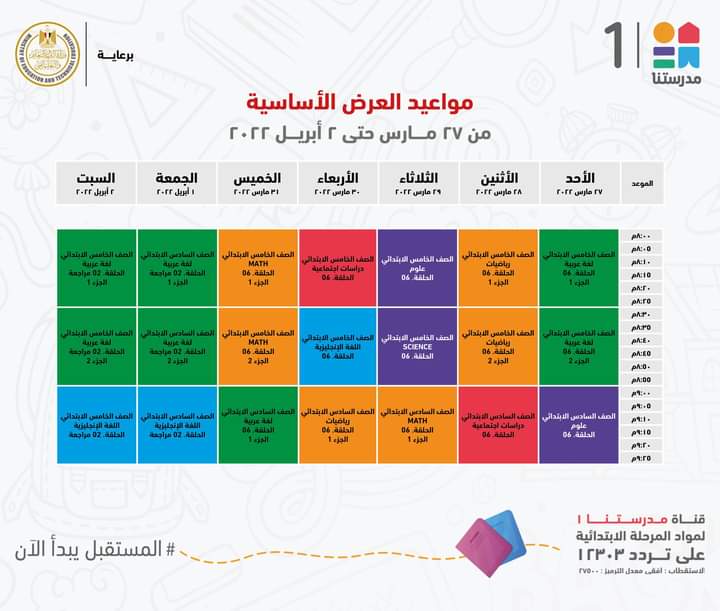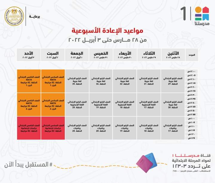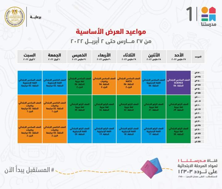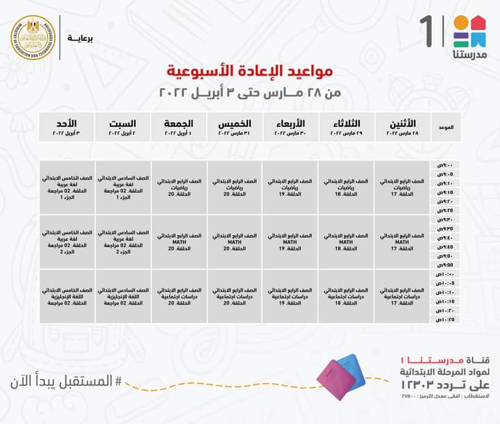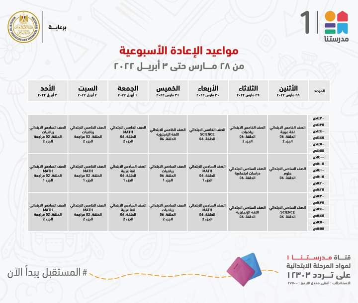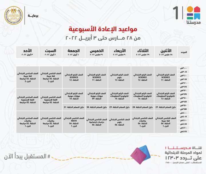 أعلنت وزارة التربية والتعليم والتعليم الفني، جداول مواعيد البرامج التعليمية لجميع صفوف المرحلة الابتدائية، لهذا الأسبوع مع الإعادة، والتي من المقرر بثها على قناة مدرستنا 1.