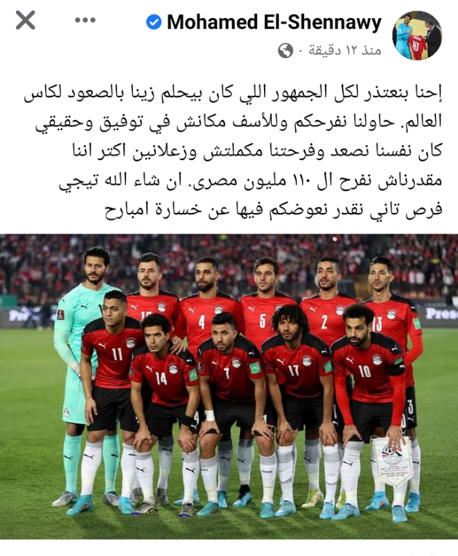 وكتب محمد الشناوي على حسابه الشخصي عبر موقع التواصل الاجتماعي تويتر: “احنا بنعتذر لكل الجمهور اللي كان بيحلم زينا بالصعود لكأس العالم، حاولنا نفرحكم وللأسف مكانش في توفيق، وحقيقي كان نفسنا نصعد وفرحتنا مكملتش وزعلانين أكتر اننا مقدرناش نفرح الـ 110 مليون مصري، إن شاء الله تيجي فرص تاني نقدر نعوضكم فيها عن خسارة امبارح”.