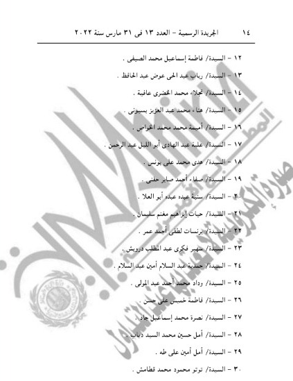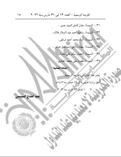 نشرت الجريدة الرسمية، في عددها الصادر اليوم الخميس، قرار الرئيس عبد الفتاح السيسي رقم 125 لسنة 2022، بمنح وسام الكمال من الطبقة الثانية لبعض السيدات.