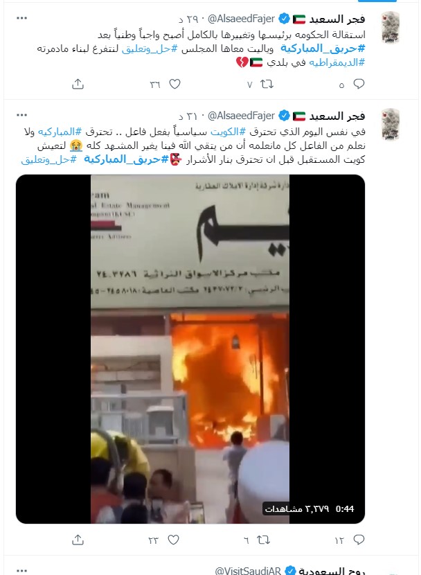 وتصدرالحريق تغريدات مستخدمي موقع التواصل الاجتماعي تويتر، في الكويت، إذ قالت الإعلامية الكويتية فجر السعيد، في تغريدة لها، إن استقالة الحكومه الكويتية برئيسها وتغييرها بالكامل أصبح واجبًا وطنيًا بعد حريق المباركية، مضيفة: «وياليت معاها المجلس حل وتعليق لنتفرغ لبناء ما دمرته الديمقراطية في بلدي».