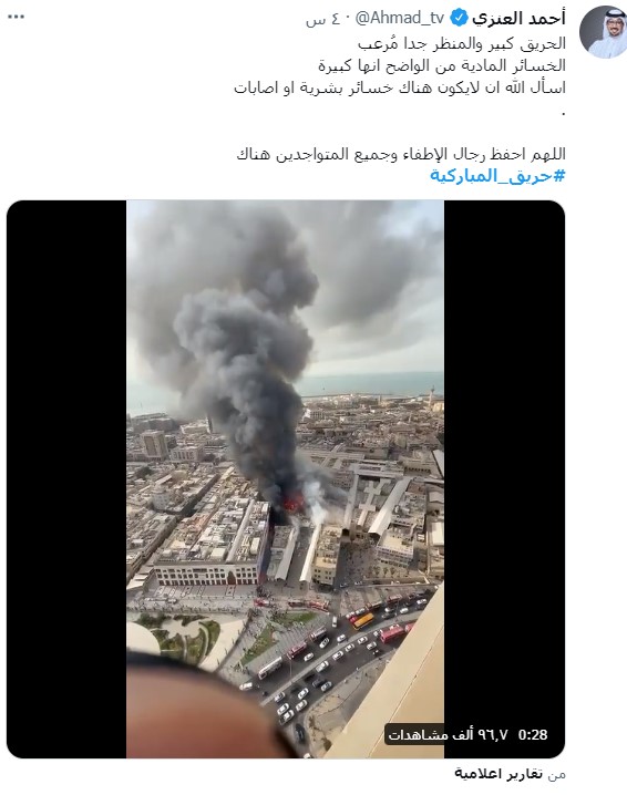 فيما قال أحمد العنزي، إن الحريق كبير ووصفه بالمنظر المرعب جدًا، وأن الخسائر المادية من الواضح أنها كبيرة.
