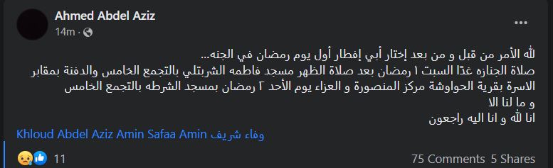 وأضاف أحمد عبد العزيز: صلاة الجنازه غدًا السبت 1 رمضان بعد صلاة الظهر بمسجد فاطمة الشربتلي بالتجمع الخامس والدفنة بمقابر الأسرة بقرية الحواوشة مركز المنصورة والعزاء يوم الأحد 2 رمضان بمسجد الشرطه بالتجمع الخامس.. وما لنا إلا أن نقول إنا لله وإنا إليه راجعون.