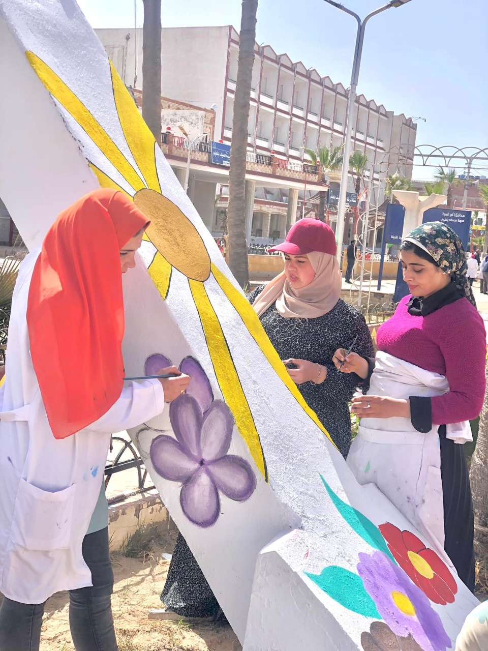 وقالت الدكتورة أماني شاكر، عميد كلية التربية النوعية: نفذ الطلاب والطالبات بعض الأشكال التجميلية والرسومات بالعديد من أحياء ومناطق المصيف، وبالجزيرة الوسطى وبعدد من الشواطئ، ومحولات الكهرباء، وبعض الأشكال بمداخل المدينة بالميادين، وعلى جدران المساجد والمصالح الحكومية.