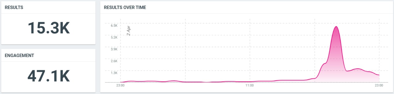 وفق أداة talkwalker سجل التغريد حول برنامج رامز جلال 15.3 ألف تغريدة، ليحصد 47.1 ألف تفاعل خلال ساعة واحدة أثناء وبعد عرض البرنامج.