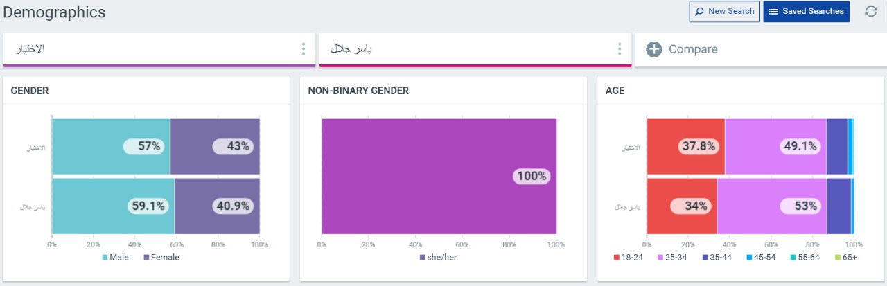 الحسابات المملوكة للذكور كانت الأكثر تغريدا لياسر جلال على تويتر بنسبة 58.9%، بينما كانت الإناث بنسبة 41.1%، أما الاختيار فكان تغريد الذكور بنسبة 57% والإناث 43%.