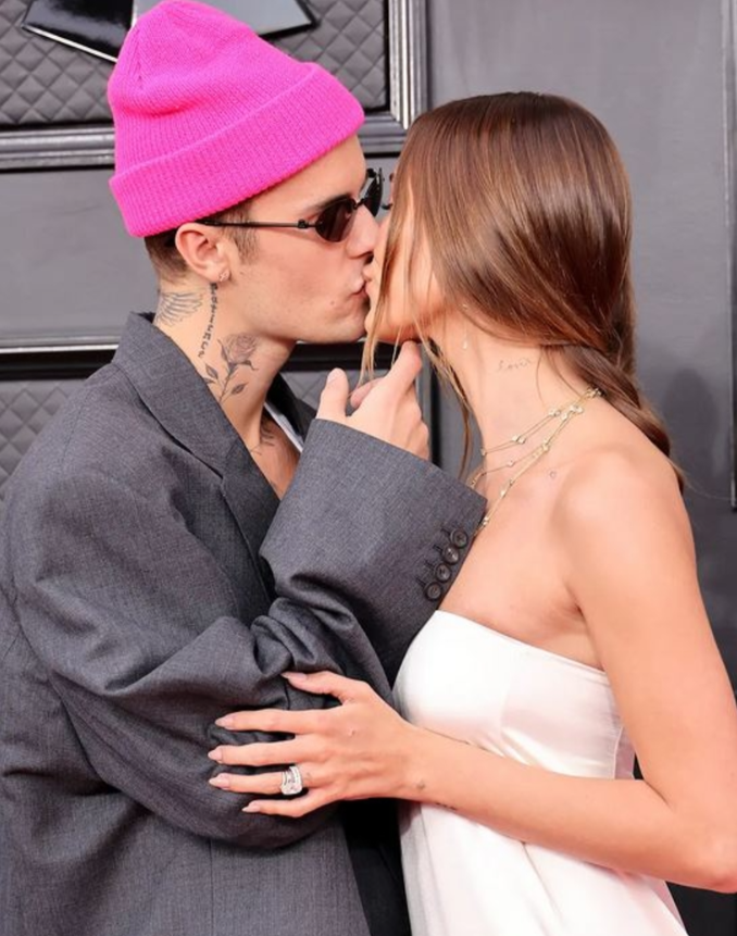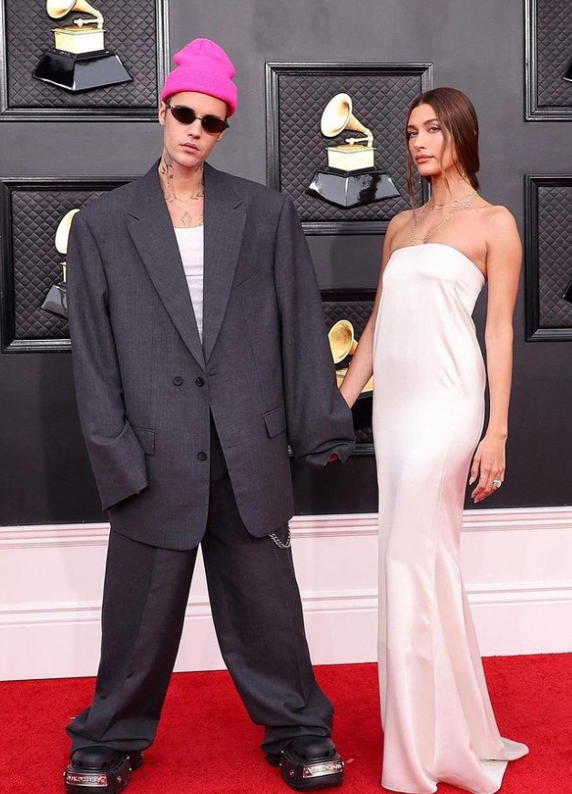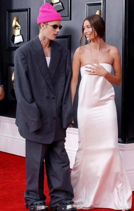 وظهر جاستن ببدلة رمادية اللون كبيرة الحجم وفضفاضة، وحذاء مدببا كبير الحجم أيضًا، ونسق معهم قبعة حمراء اللون، وذلك رفقة زوجته عارضة الأزياء هايلي بالدوين، التي ارتدت فستانًا أبيض اللون، طويل، ومكشوف الصدر، مع شعر منسدل على الكتفين، ولفتا الأنظار على السجادة الحمراء، لإبراز حبهما لبعضهما البعض من خلال قُبلة.