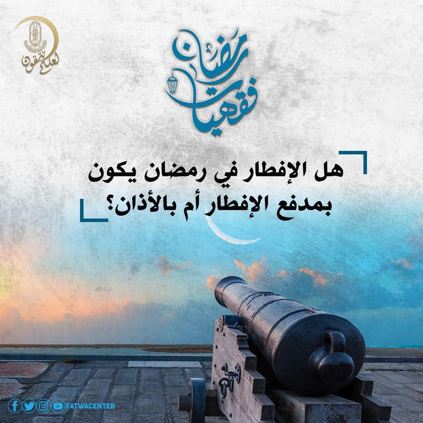 وقال الأزهر للفتوى عبر حسابه على موقع التواصل الاجتماعي فيسبوك: إن مدفع الإفطار وأذانَ المغرب علامتان على غروب الشمس، ويكونان في وقت واحد ولا تعارض بينهما، ففطر الصائم بغروب الشمس لا بالأذان ولا بمدفع الإفطار؛ لقوله تعالى: ثُمَّ أَتِمُّوا الصِّيَامَ إِلَى اللَّيْلِ.