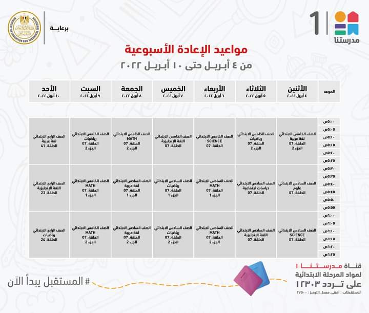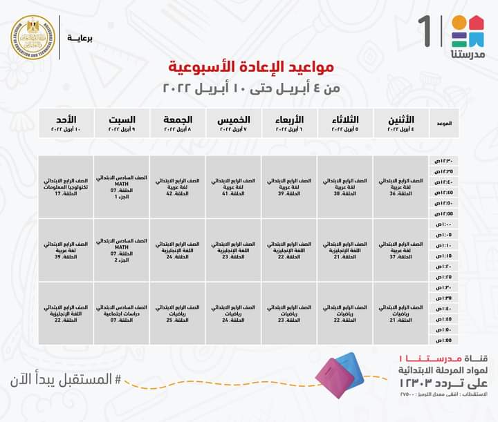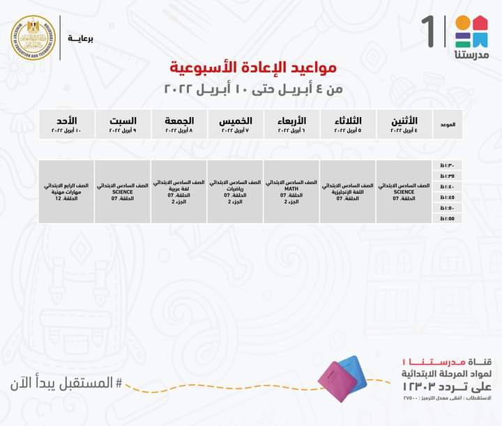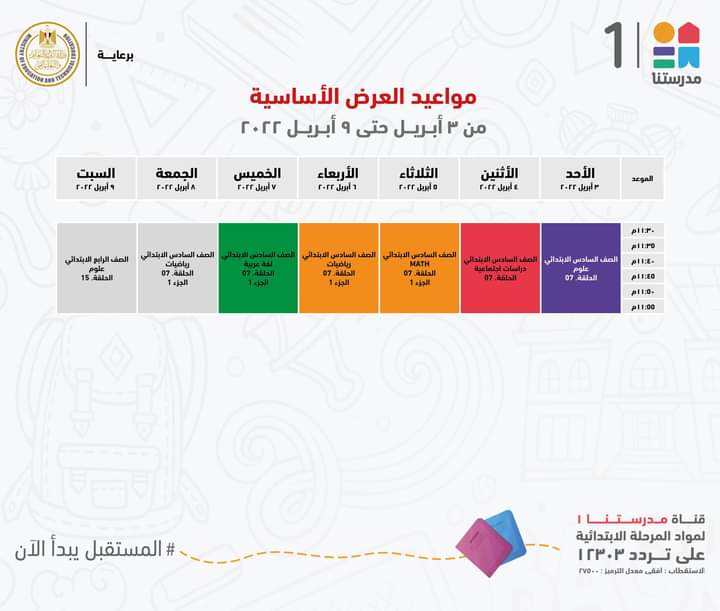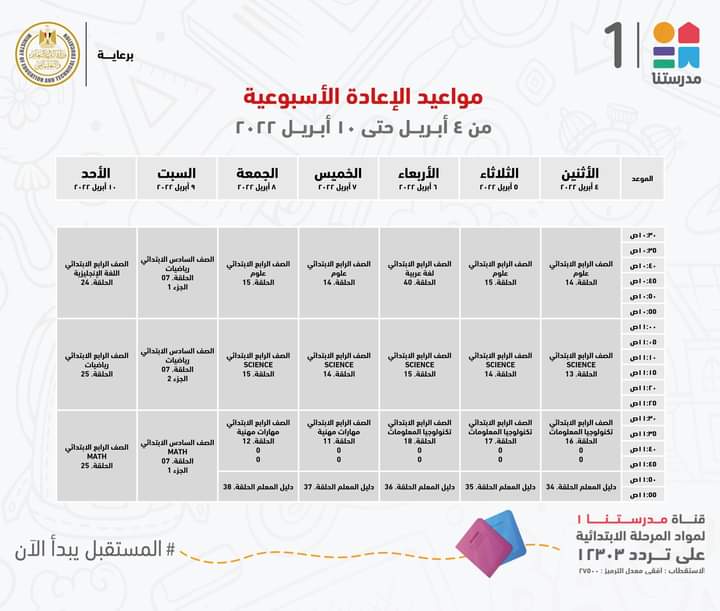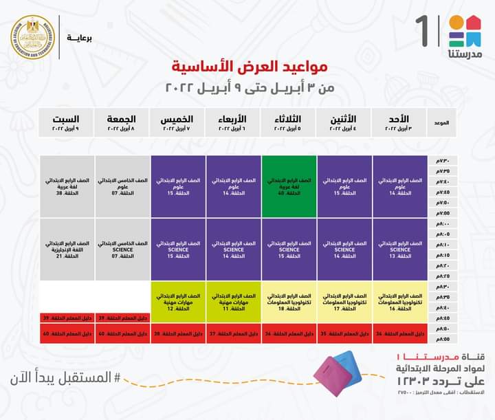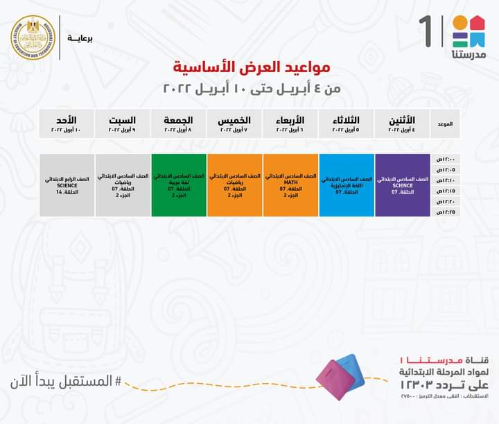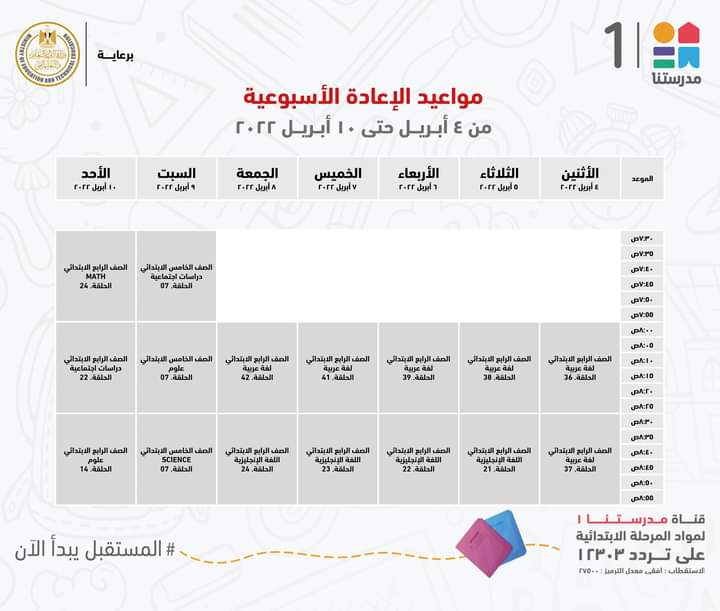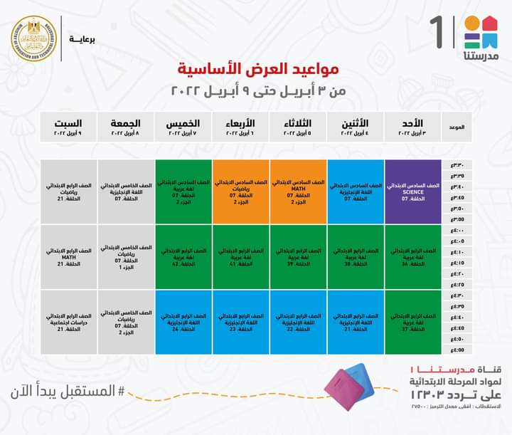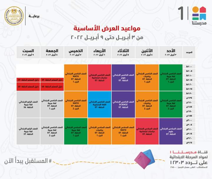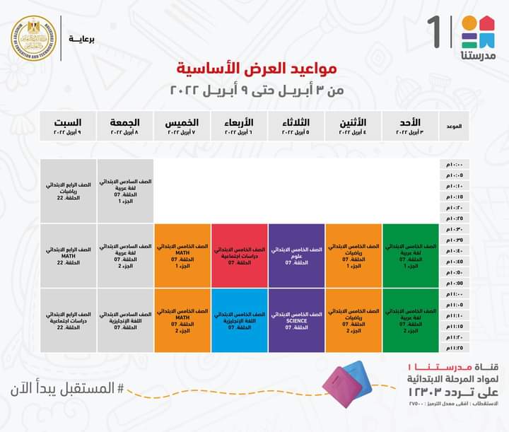 أعلنت وزارة التربية والتعليم والتعليم الفني، جداول مواعيد عرض البرامج التعليمية للصفوف الابتدائية لهذا الأسبوع مع الإعادة، والتي من المقرر بثها على قناة مدرستنا 1.
