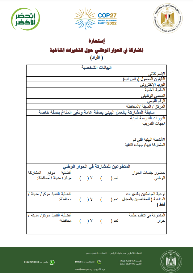 ووفقا لما نشرته الوزارة عبر موقعها الإلكتروني، يمكن المشاركة في الحوار الوطني للتغيرات المناخية للأفراد والمؤسسات من خلال تعبئة الاستمارة وتوضيح ما إذا تم المشاركة من قبل في العمل البيئي بصفة عامة وتغير المناخ بصفة خاصة، وكذلك وجود فرصة لمشاركة المتطوعين في الحوار الوطني الذي يستهدف رفع الوعي البيئي لدى المواطنين ضمن خطة التحضير لاستضافة مؤتمر المناخ.