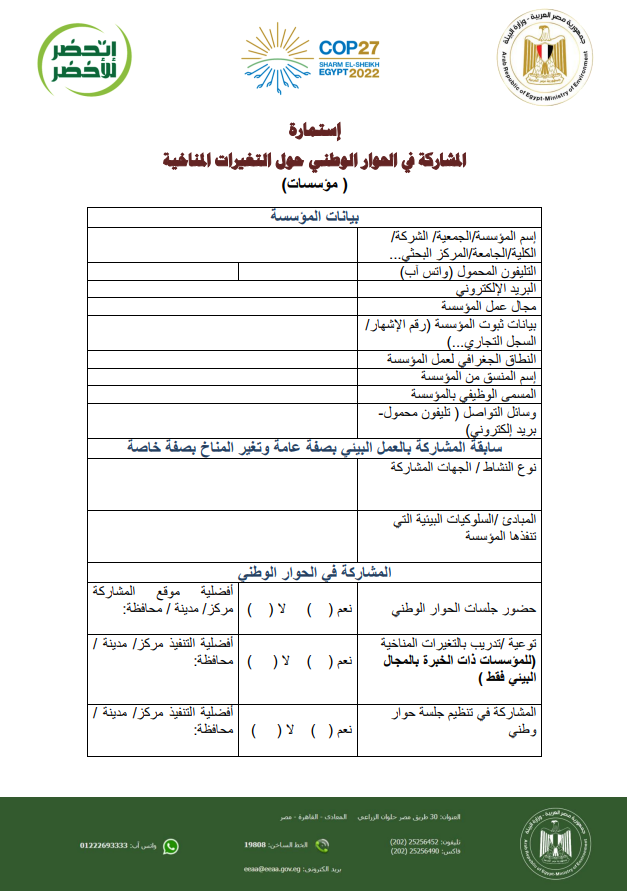 كما أتاحت وزارة البيئة المشاركة في الحوار الوطني للتغيرات المناخية للمؤسسات أيضًا، وذلك من خلال ملء استمارة المشاركة عبر الموقع الإلكتروني للوزارة، ويتطلب كتابة البيانات التالية: