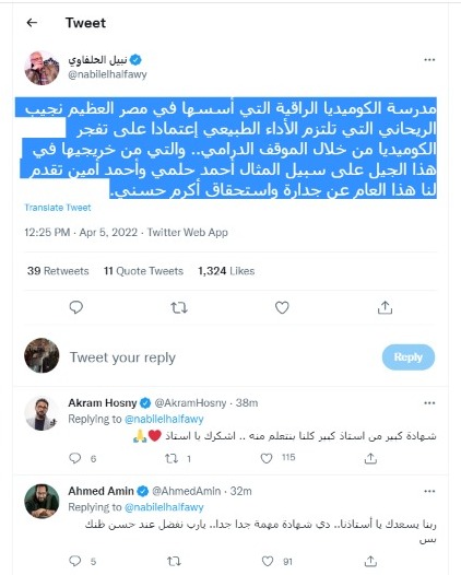 ومن جانبه، أعرب الفنان أكرم حسني عن سعادته الكبيرة بإشادة الحلفاوي بموهبته، حيث قال في تغريدة له: شهادة كبير من أستاذ كبير، كلنا بنتعلم منه، أشكرك يا أستاذ نبيل.