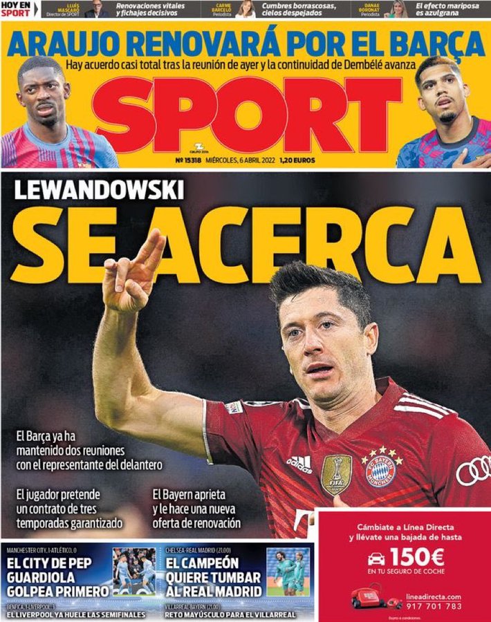 تصدر النجم البولندي روبرت ليفاندوفسكي هداف فريق بايرن ميونخ، غلاف سبورت لعدد اليوم، وذلك بعنوان ليفاندوفسكي أقرب، وأوضحت الصحيفة أن برشلونة أجرى بالفعل اجتماعين مع ممثل المهاجم.