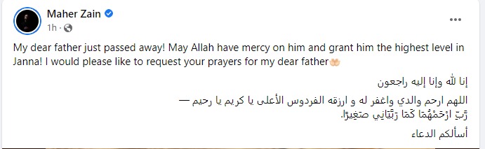 وكتب ماهر زين، عبر حسابه الشخصي بموقع التواصل الاجتماعي فيس بوك: والدي العزيز قد وافته المنية للتو، رحمه الله وأعطاه أعلى درجات الجنة، أود من فضلكم أن أطلب صلاتكم من أجل والدي العزيز.. إنا لله وإنا إليه راجعون.. اللهم ارحم والدي واغفر له واسكنه الفردوس الأعلى يا كريم يا رحيم.. رب ارحمهما كما ربياني صغيرا.. أسألكم الدعاء.