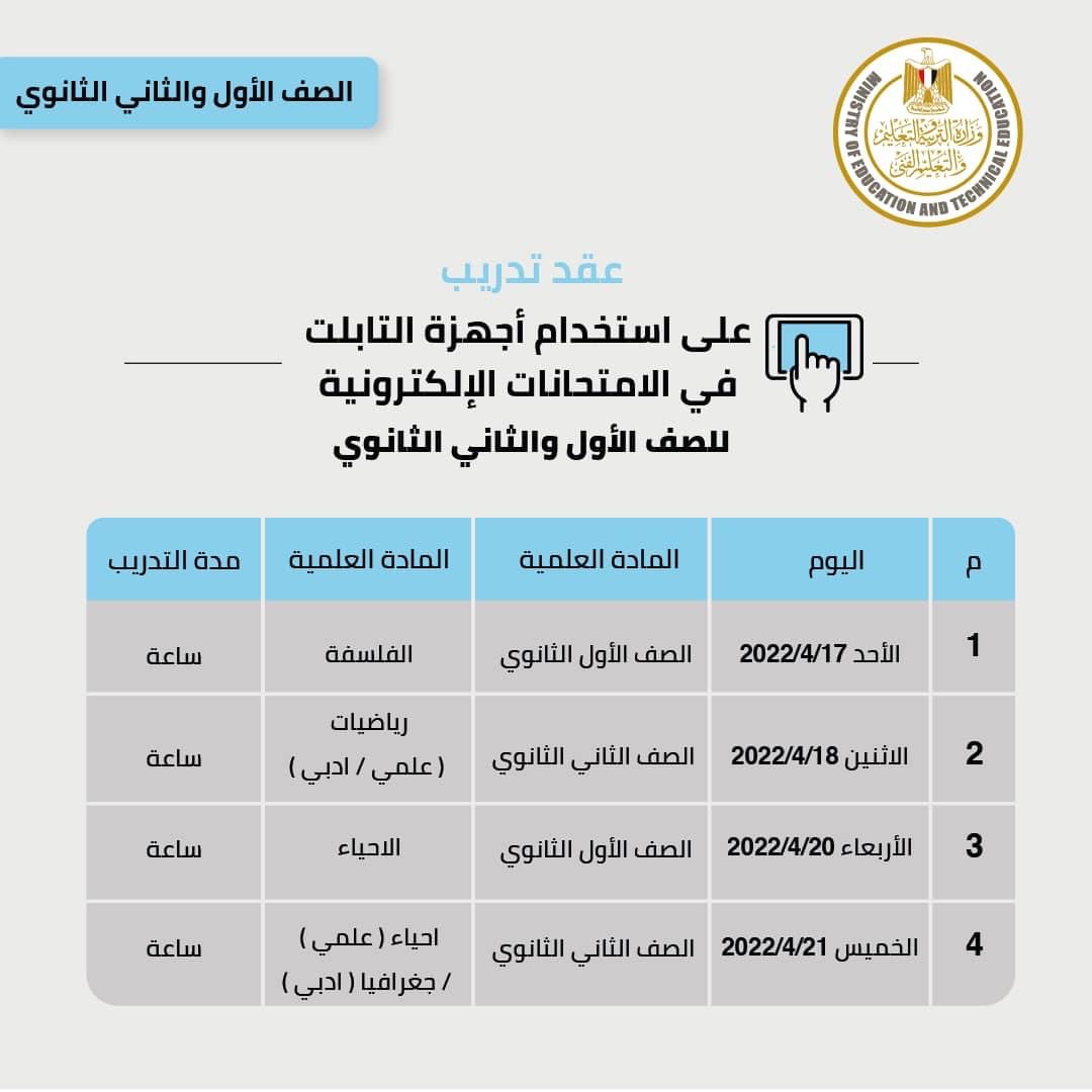 قررت وزارة التربية والتعليم عقد تدريب على استخدام أجهزة التابلت في الامتحانات الإلكترونية لجميع الطلاب بالصفين الأول والثاني الثانوي اعتبارًا من يوم الأحد الموافق 2022/4/17