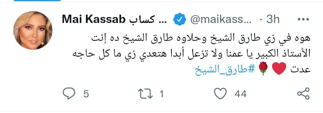 وعبرت مي كساب عن دعمها له، قائلة عبر حسابها موقع التدوينات القصيرة تويتر: هو في زي طارق الشيخ وحلاوة طارق الشيخ.. ده الأستاذ الكبير.. يا عمنا ولا تزعل أبدا هتعدي زي ما كل حاجه عدت.