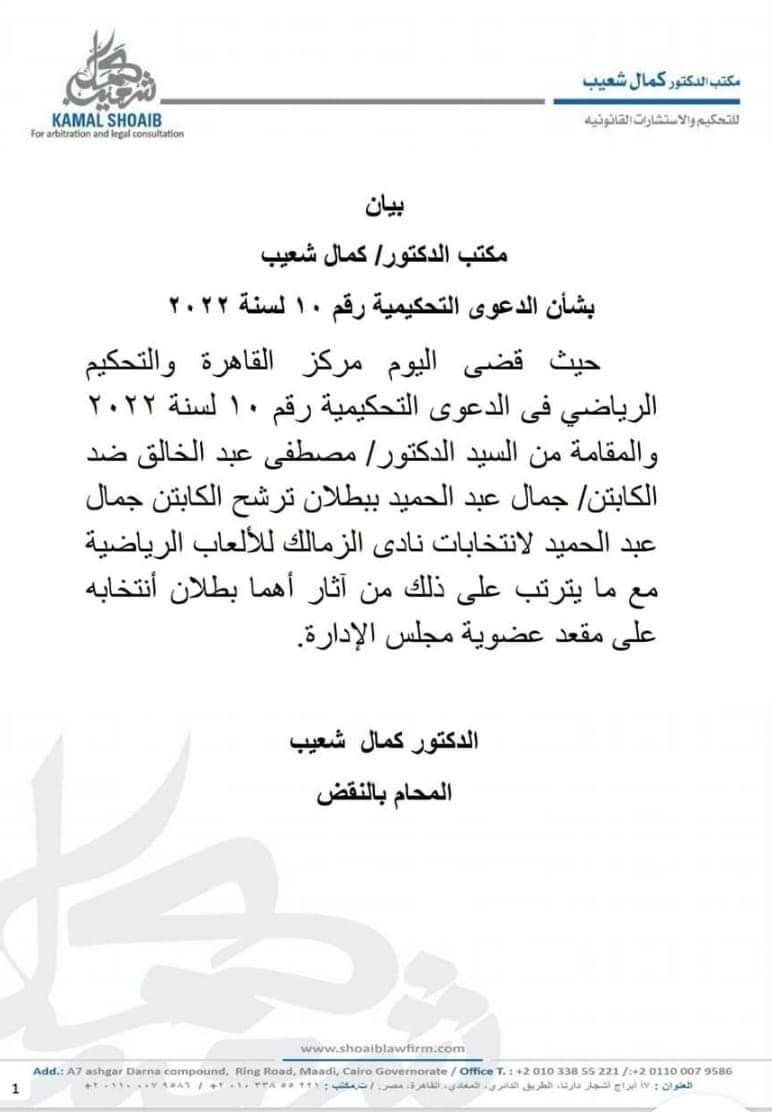 وجاء نص حكم مركز القاهرة والتحكيم الرياضي كالتالي: قضى اليوم مركز القاهرة والتحكيم الرياضي في الدعوى التحكيمية رقم 10 لسنة 2022، والمقامة من الدكتور مصطفى عبد الخالق ضد جمال عبد الحميد ببطلان ترشح عبد الحميد في الانتخابات نادى الزمالك للألعاب الرياضية مع ما يترتب على ذلك من أثار بطلان انتخابه على مقعد عضوية مجلس الإدارة.