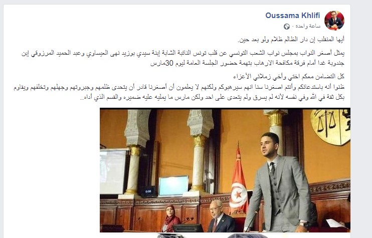 وفي منشور له على موقع التواصل الاجتماعي فيس بوك، قال أسامة الخليفي، النائب عن حزب قلب تونس، أنه سيخض اليوم الجمعة برفقة عدد من نواب الحزب بمجلس النواب المنحل، للتحقيق أمام النيابة التونسية لمشاركتهم في الجلسة العامة التي عقدت 30 مارس الماضي.