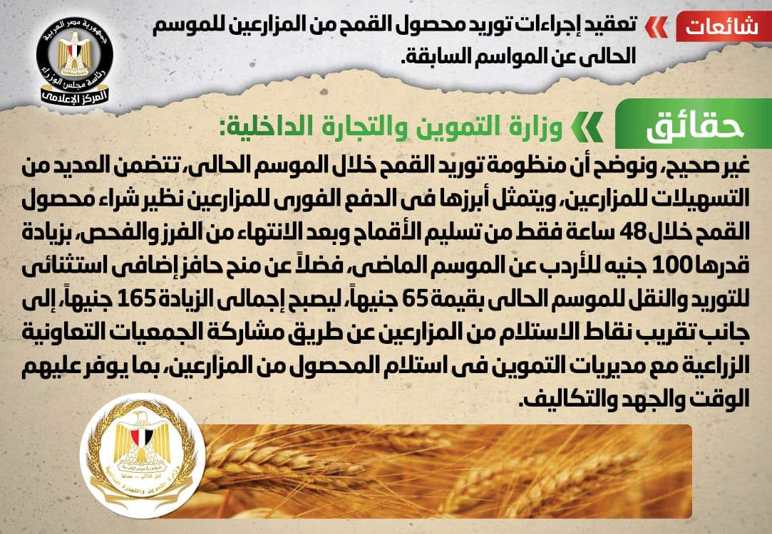 وتواصل المركز الإعلامي لـ مجلس الوزراء، مع وزارة التموين والتجارة الداخلية، وأكدت أنه لا صحة لتعقيد إجراءات توريد محصول القمح من المزارعين للموسم الحالي عن المواسم السابقة، مُوضحةً أن منظومة توريد القمح خلال الموسم الحالي، تتضمن العديد من التسهيلات للمزارعين، ويتمثل أبرزها في الدفع الفوري للمزارعين نظير شراء محصول القمح خلال 48 ساعة فقط من تسليم الأقماح وبعد الانتهاء من الفرز والفحص، بزيادة قدرها 100 جنيه للأردب عن الموسم الماضي.