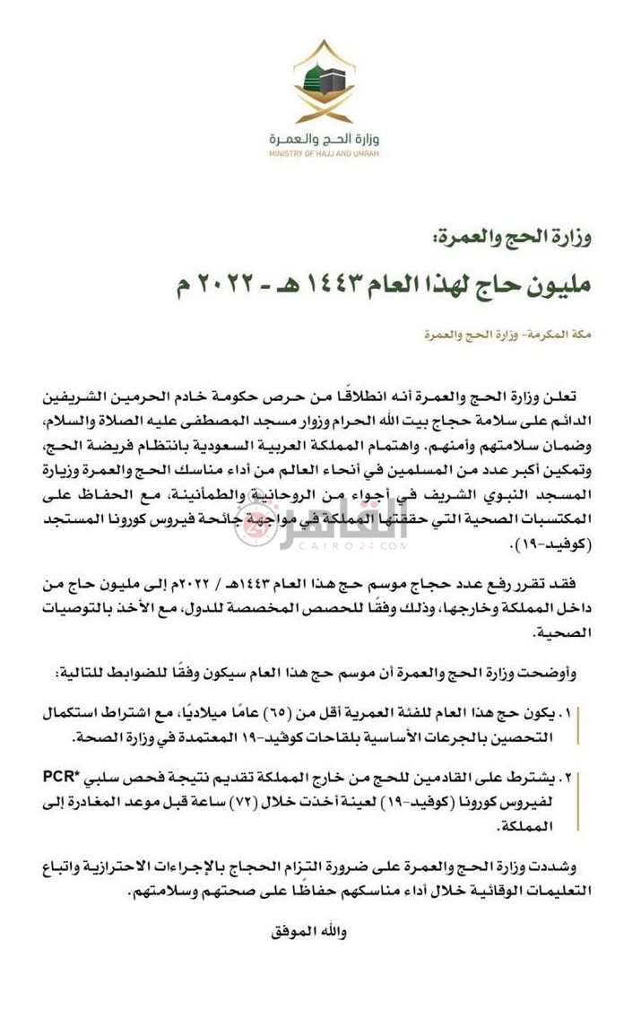 وتقرر رفع عدد حجاج موسم حج هذا العام 1443هـ/ 2022م إلى مليون حاج من داخل المملكة وخارجها، وذلك وفقا للحصص المخصصة للدول، مع الأخذ بالتوصيات الصحية.