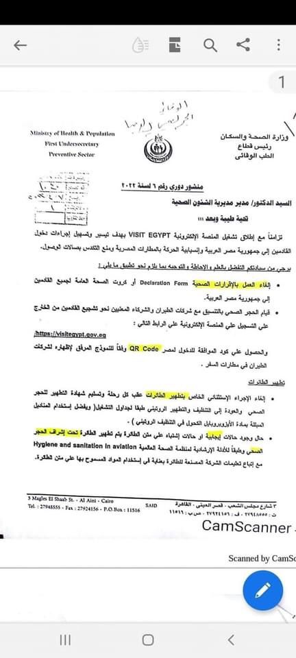 وتضمن المنشور، ضرورة قيام الحجر الصحي بالمطار بالتنسيق مع شركات الطيران نحو تشجيع القادمين من الخارج على التسجيل على المنصة الإلكترونية عبر رابط https.Visitegypt.com والحصول على كود الموافقة للدخول إلى مصر QR Code.