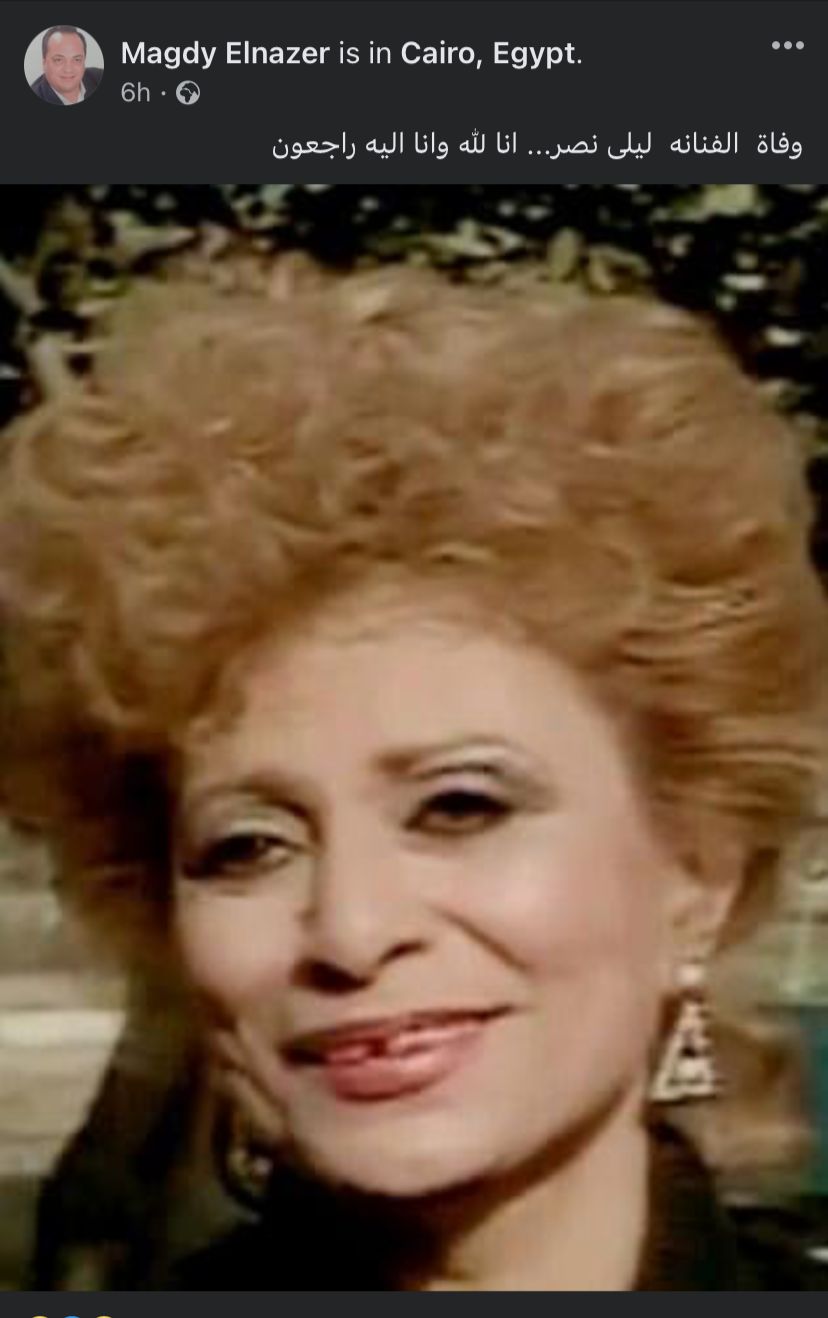 وأعلن المخرج مجدي الناظر وفاة الفنانة ليلى نصر، عبر حسابه الرسمي بموقع التواصل الاجتماعي فيسبوك، وقام بنشر صورة لها، معلقًا عليها: “وفاة الفنانة ليلى نصر. إنا لله وإنا إليه راجعون”.