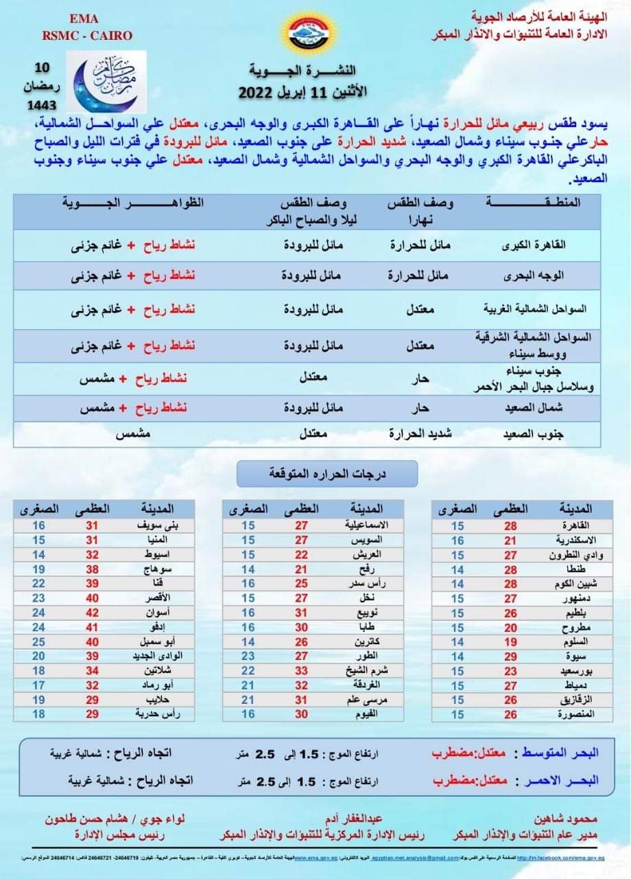 تتوقع هيئة الأرصاد الجوية أن يسود غدا الاثنين الموافق 10 رمضان، طقس ربيعي مائل للحرارة نهارًا على القاهرة الكبرى والوجه البحري، معتدل الحرارة على السواحل الشمالية، حار على جنوب سيناء وشمال الصعيد، شديد الحرارة على جنوب الصعيد.