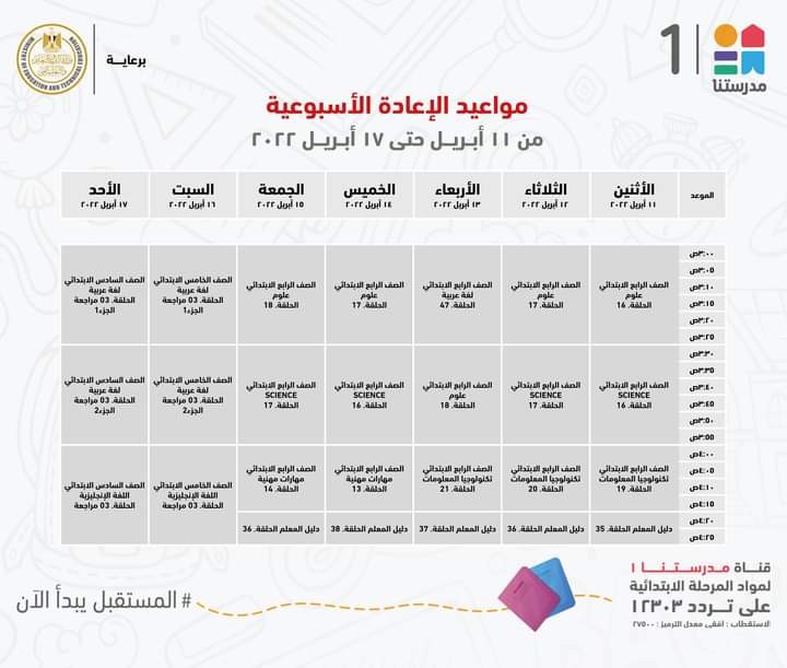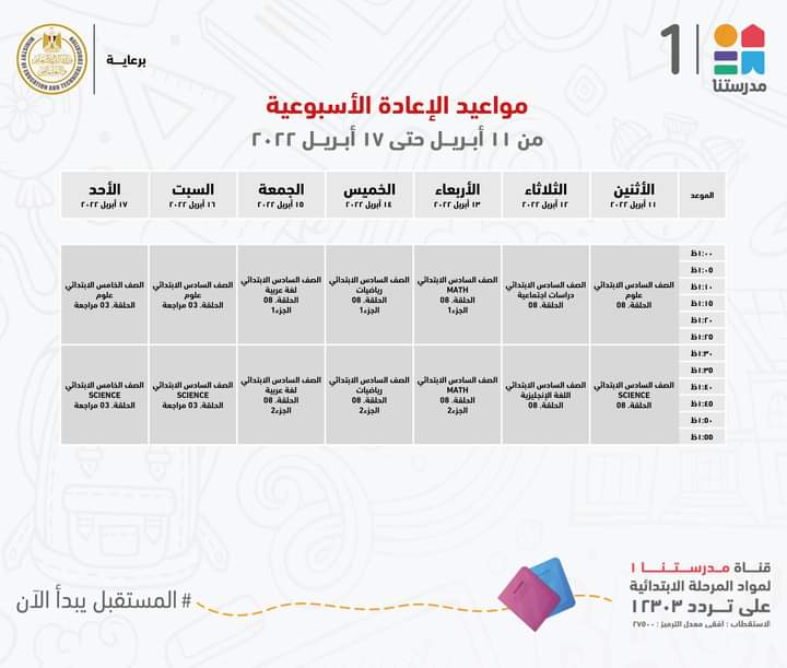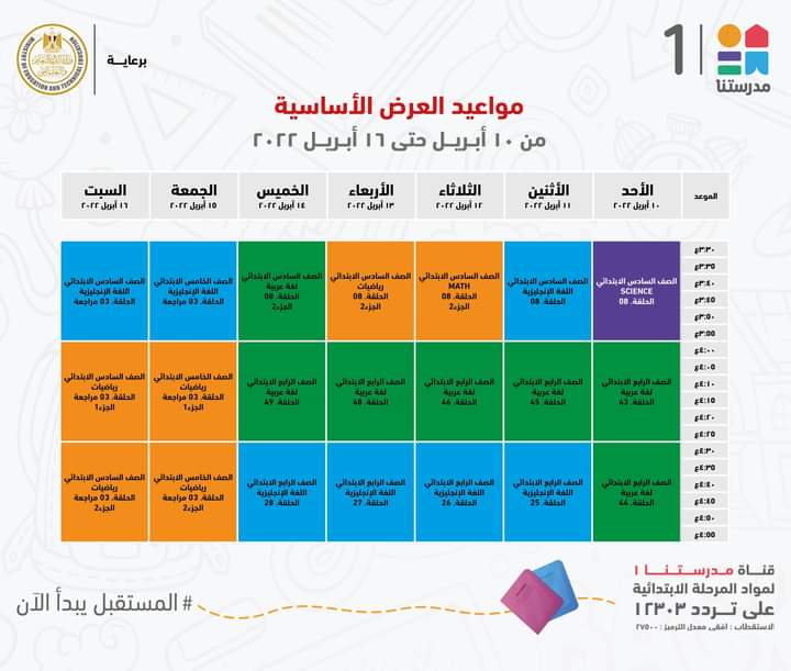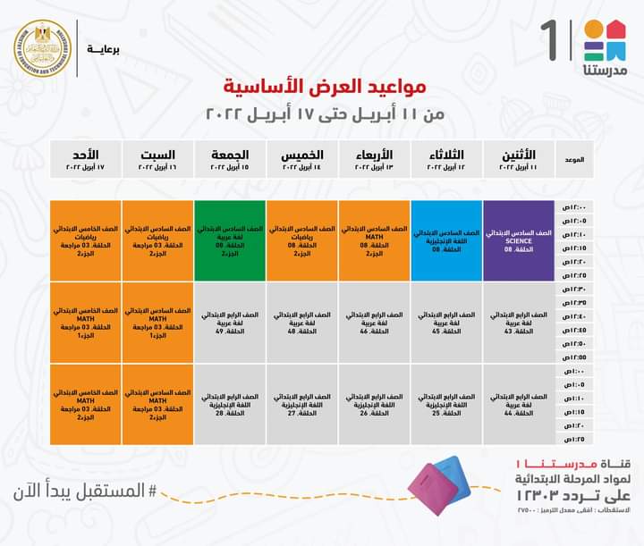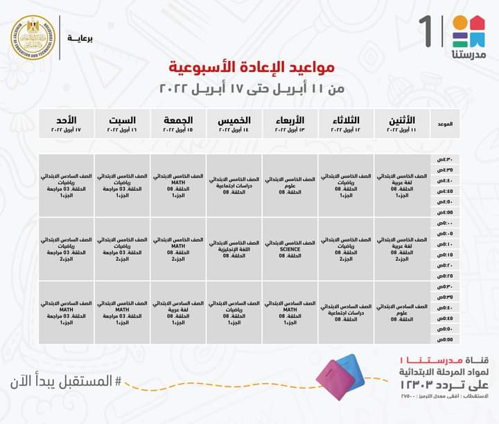 أعلنت قناة مدرستنا، التابعة لوزارة التربية والتعليم والتعليم الفني، جداول مواعيد عرض البرامج التعليمية لجميع الصفوف الابتدائية لهذا الأسبوع مع الإعادة.
