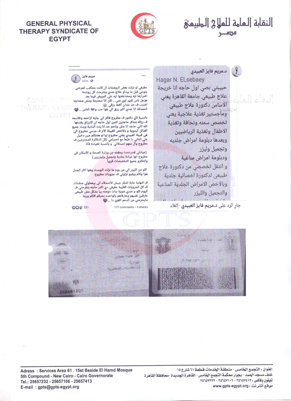 وتقدمت النقابة العامة للعلاج الطبيعي ببلاغ للنيابة العامـة وبـلاغ لوزارة الصحة وجهاز حماية المستهلك ضـد المذكورة، مريم فايز العبيدي، وضد المراكز التي تعمل بهـا علمـا بأنهـا تحـمـل بطاقة رقم قومي مسجل المهنـة بهـا أخصائية عناية بالبشرة ومن غير المعروف المذكورة خريجـة أي كليـة وتهيـب النقابة العامة للعلاج الطبيعي السادة المواطنين عـدم التعامل مـع الـدخلاء والتأكـد مـن كارنيـه مزاولة المهنة الصادر من النقابة العامة وترخيص وزارة الصحة يأتي ذلك في ضوء الحرب علي الدخلاء والأدعياء لمهنة العلاج الطبيعي.