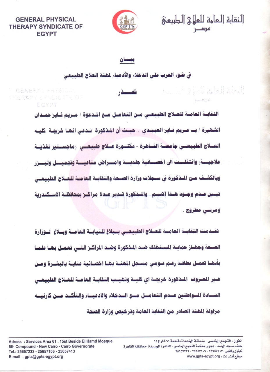حذرت النقابة العامة للعلاج الطبيعي من التعامل مع المدعوة مريم فايز حمـدان الشهيرة بـ مريم فايز العبيدي، حيث أن المذكورة تدعي أنهـا خريجة كليـة العلاج الطبيعـي جامعة القاهرة - دكتورة علاج طبيعـي وحاصلة على ماجستير تغذيـة علاجية.
