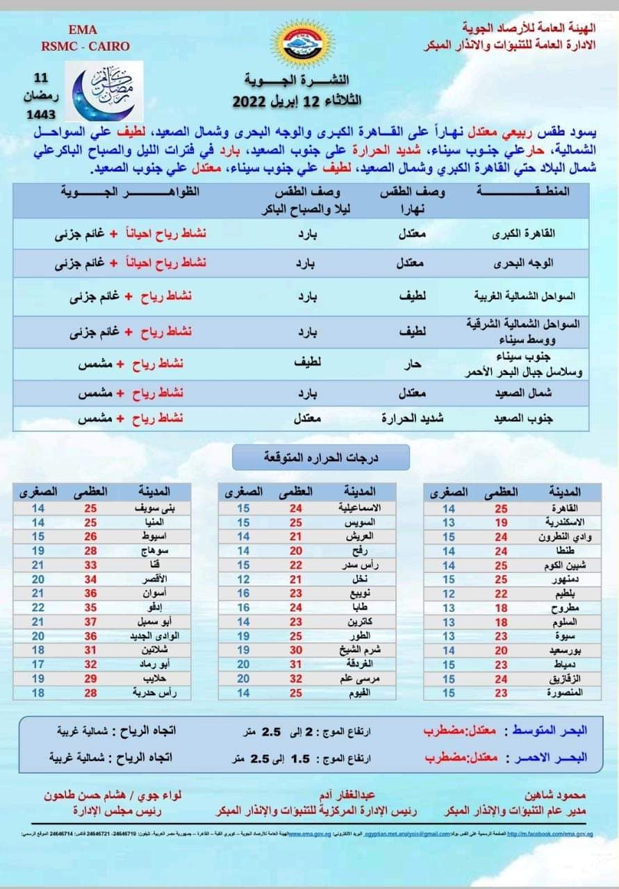 تتوقع الهيئة العامة للأرصاد الجوية أن يسود اليوم الثلاثاء الموافق 12 أبريل، طقس ربيعي معتدل الحرارة نهارا على القاهرة الكبرى والوجه البحري وشمال الصعيد، لطيف على السواحل الشمالية حار على جنوب سيناء، يكون شديد الحرارة على جنوب الصعيد.