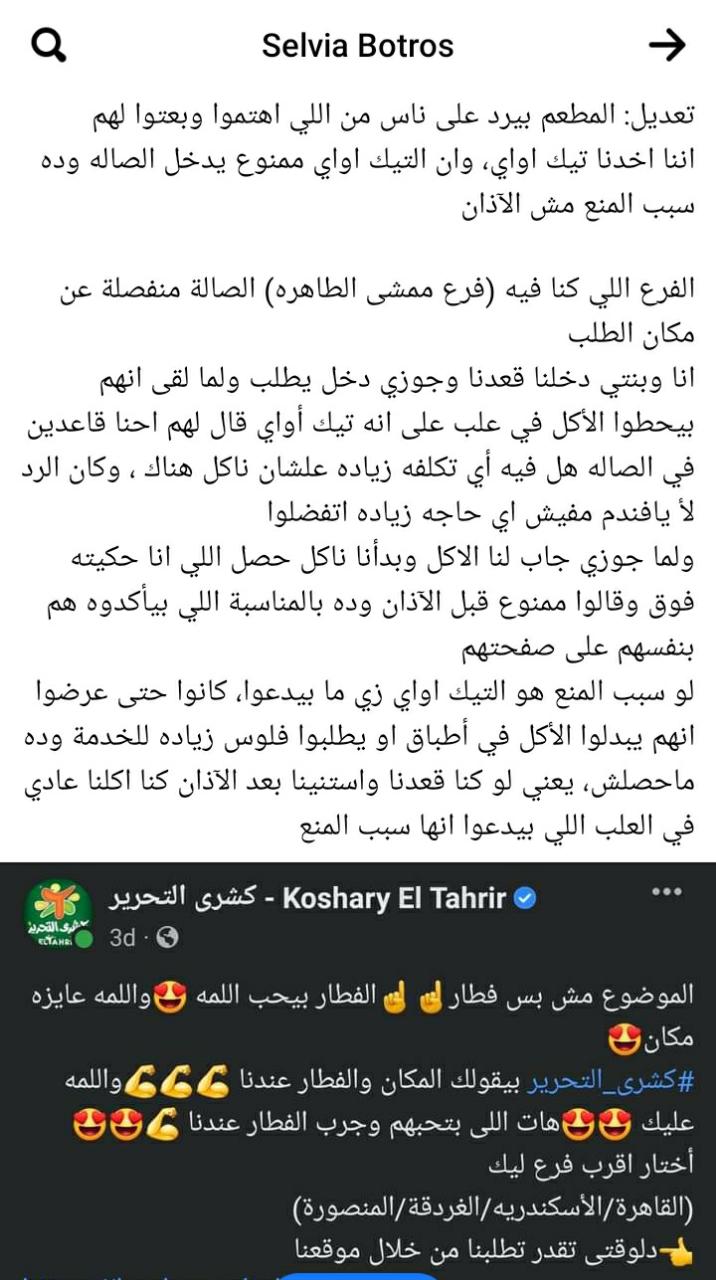 أثار بوست لسيدة تدعي سلفيا بطرس جدل مستخدمي مواقع التواصل الاجتماعي والذي كشف رفض إدارة مطعم كشري شهير في القاهرة تقديم وجبتي طعام لها ولطفلتها إلا بعد أذان المغرب.
