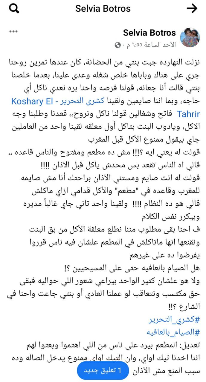 وقالت سلفيا بطرس عبر منشورها بموقع التواصل الاجتماعي فيس بوك: “نزلت النهارده جبت بنتي من الحضانة، كان عندها تمرين روحنا جري على هناك وباباها خلص شغله وعدى علينا، بعدما خلصنا بنتي قالت أنا جعانه، قولنا فرصه وأحنا بره نعدي ناكل أي حاجه، وبما اننا صايمين وجدنا أحد مطاعم الكشري فاتح وشغالين قولنا ناكل ونروح، قعدنا وطلبنا وجه الأكل، ويادوب البنت بتاكل أول معلقه لقينا واحد من العاملين جاي بيقول ممنوع الأكل قبل المغرب”.