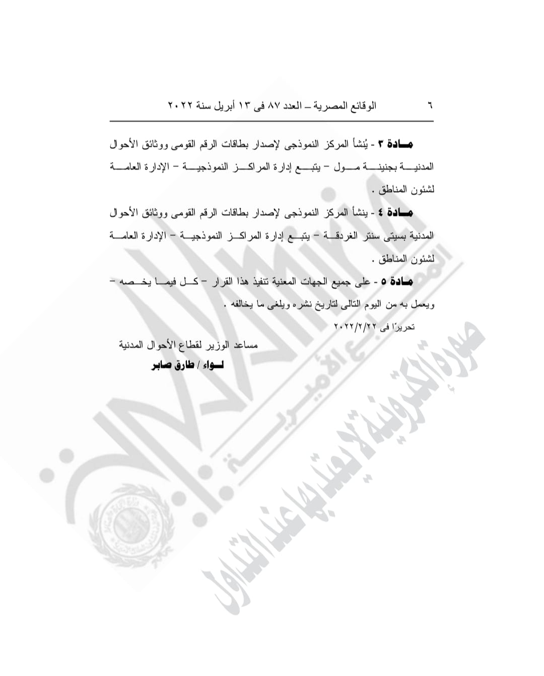 كما تضمن القرار إنشأ المركز النموذجي لإصدار بطاقات الرقم القومي ووثائق الأحوال المدنيـة بجنينـة مـول - يتبـع إدارة المراكـز النموذجيـة الإدارة العامـة لشئون المناطق، وينشأ المركز النموذجي لإصدار بطاقات الرقم القومي ووثائق الأحوال المدنية بسيتي سنتر الغردقـة – يتبـع إدارة المراكـز النموذجيـة – الإدارة العامـة، لشئون المناطق.