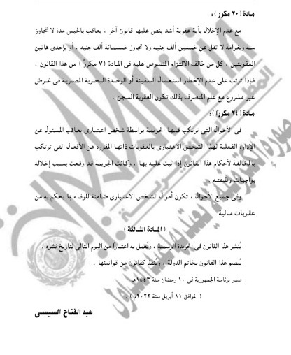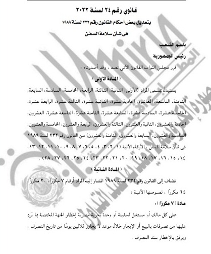 كما نصت المادة الثانية: تضاف إلى القانون رقم 232 ل 1989 المشار إليه المواد أرقام 7 مكررا، 20 مكررا، 24 مكررا، نصوصها الآتية: مادة 7 مكرر، على كل مالك أو مستغل السفينة أو وحدة بحرية مصرية إخطار الجهة المختصة بما يرد عليها من تصرفات بالبيع أو الإيجار خلال موعد لا يجاوز 30 يوما من تاريخ التصرف، ويرفق بالإخطار سند التصرف، مع عدم الإخلال بأية عقوبة أشد ينص عليها قانون آخر، يعاقب بالحبس مدة لا تجاوز سنة، وبغرامة لا تقل عن 50 ألف جنيه ولا تجاوز 500 ألف جنيه، أو بإحدى هاتين العقوبتين، كل من خالف الالتزام المنصوص عليه في المادة 7 مكررا من هذا القانون - فإذا ترتب على عدم الإخطار؛ استعمال السفينة أو الوحدة البحرية المصرية في غرض غير مشروع مع علم المنصرف بذلك؛ تكون العقوبة السجن.